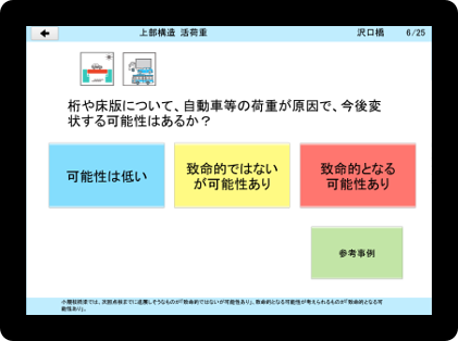A system using tablet devices is being developed to improve the efficiency of inspections of small bridges with spans of 5m or less. Inspections can be easily carried out by municipality staffs or employees of local construction companies, not just by engineers at construction consulting companies that specialize in inspections. By reducing the amount of inspection works, some municipalities have been able to reduce costs by around 90% including post-processing such as recording and output.