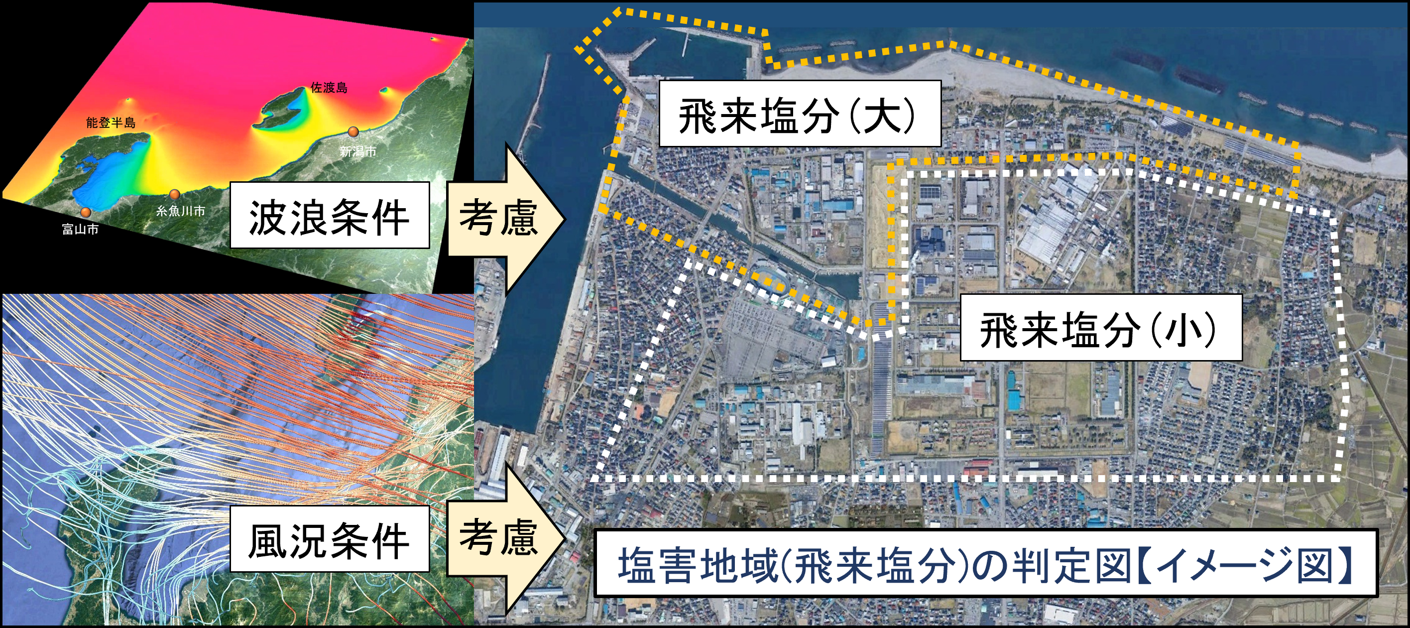 A map of chloride attack areas is being created that can determine the amount of chloride that is flied from the coast, taking into account local winds, waves, etc. This map is useful in determining the maintenance priorities of bridges near the coast.