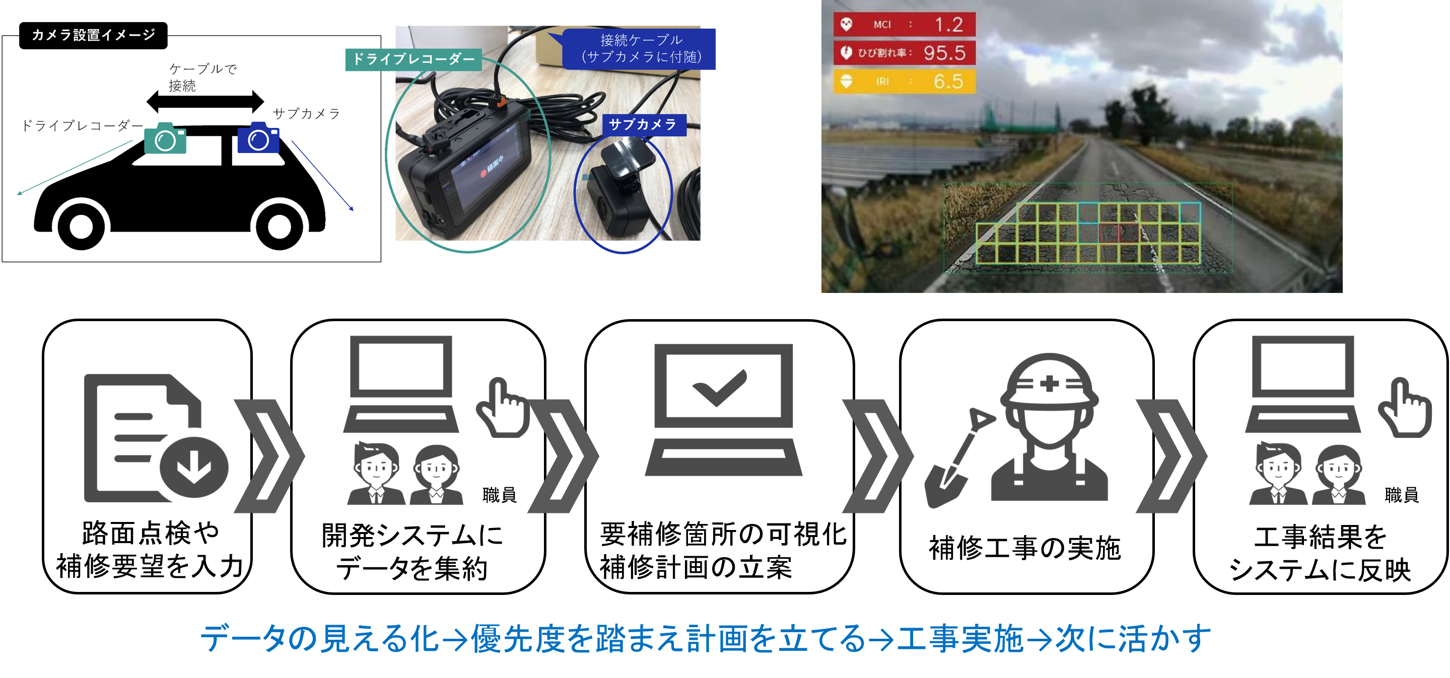 Digital inspection technology is being created to streamline road inspections and support repair plans by municipalities. That is, AI is used to automatically evaluate roads that are managed by a few staff of municipality in order to efficiently and effectively inspect them. Also, areas that need pavement repair are quickly identified. Furthermore, a system is developed that provides technical support to determine priorities for effectively using limited budgets and appropriate repair methods according to the state of damage. As a result, it will be possible to optimize municipal budgets while maintaining good road surfaces.