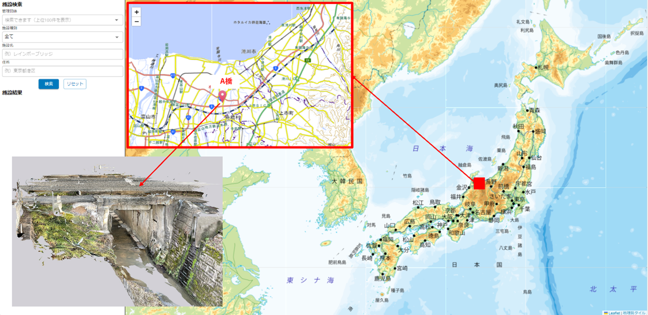 For small concrete bridges, research results from other sub-themes, facility specifications, inspection records, and other data are being aggregated, and a system is being developed that can be used by municipalities for mid- to long-term maintenance using digital twins. A system is established that allows the collected data to be used for linked maintenance management, and information is disseminated on a portal site that can be accessed by municipal staffs.